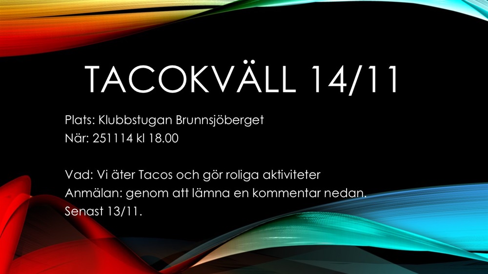 Äntligen dags för första vinteraktiviteten. Alla ungdomar är välkomna på tacokväll i Klubbstugan. Hoppas vi ses!